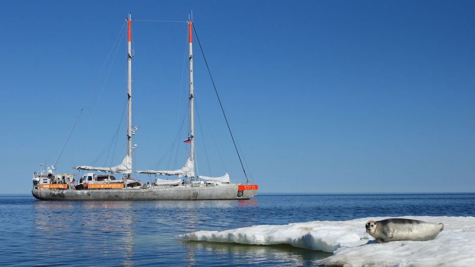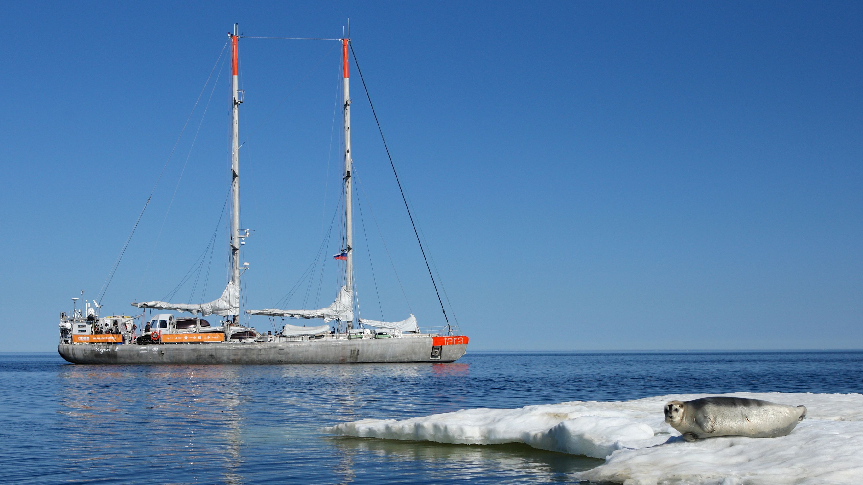 Seal on an iceberg in front of Tara research vessel © ANNA DENIAUD, Tara Expeditions Foundation.