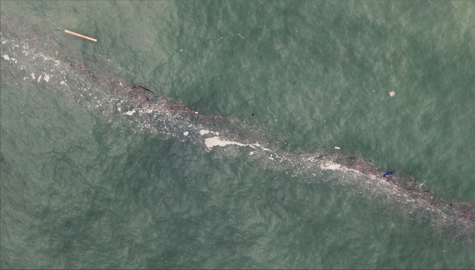 Aerial drone image of a litter windrow in Bay of Biscay, Spain. Windrow width: 1-2 metres. © Rivages Pro Tech, Suez Eau France.